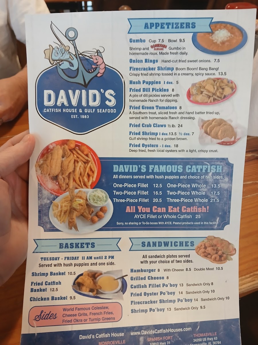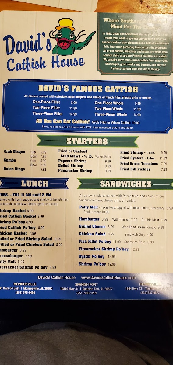 Welcome to David's Catfish House, a must-visit culinary gem located at 34200 US-43, Thomasville, AL. This charming eatery is renowned for its mouthwatering seafood, particularly the all-you-can-eat catfish, praised by loyal patrons like Denise Hayes who can’t resist stopping by whenever they’re in town.
